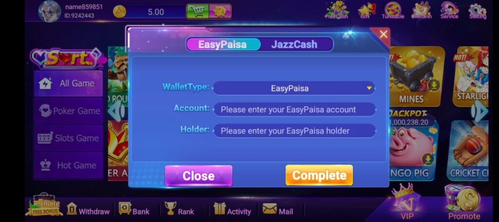 - Deposits & Withdrawals: The platform typically supports local payment methods (e.g., JazzCash, EasyPaisa) to add funds or cash out winnings. (Ow777)