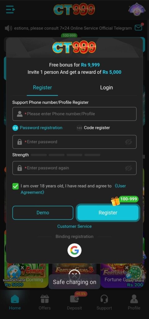 CT999 Game Register And Login To Win R$,530 PKR