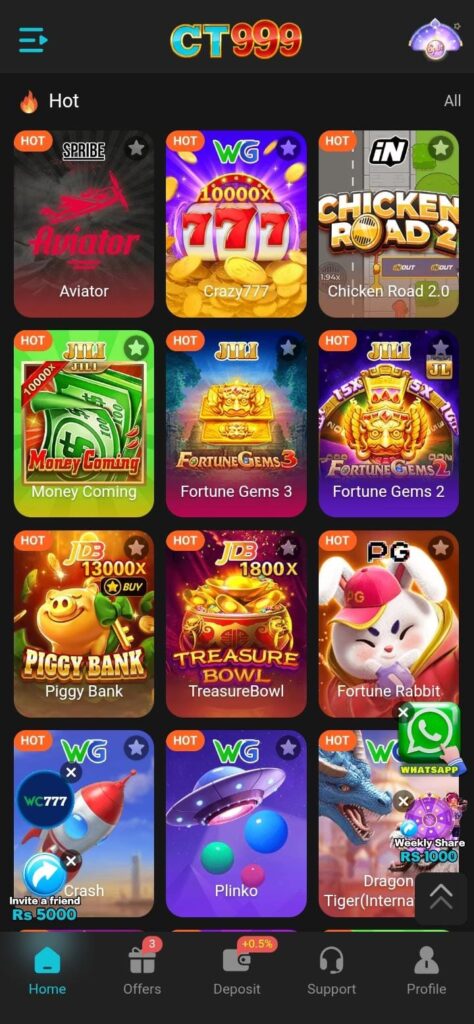 CT999 is an online gaming platform where players can play different luck-based and skill-based games. Users can earn money by participating in games like slots, color prediction, card games, and casino classics. The platform is suitable for both beginners and experienced players.