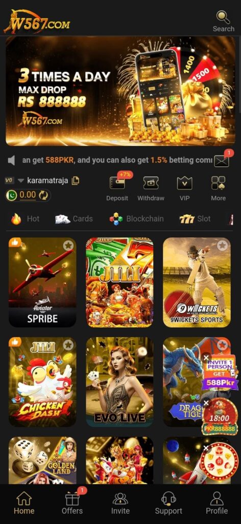 W567 Game is an online casino-style earning app popular in Pakistan that lets users play simple games (like color prediction, slots, card games, and crash games) to win real money. It combines gaming + earning, where players can deposit, play, and withdraw cash through local payment methods. 567.com Game (often called) K666 game apk earning real money.